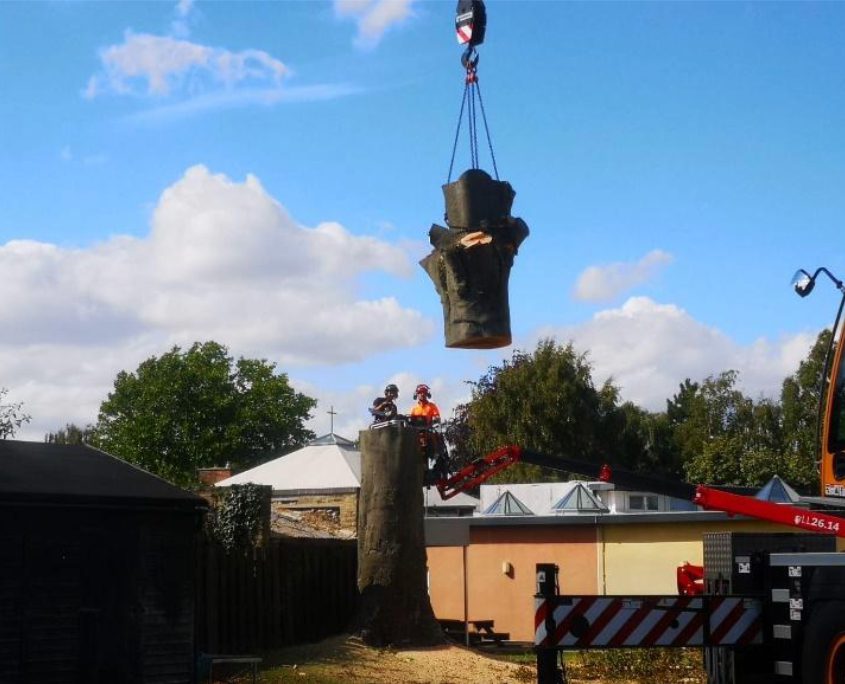 - Due to the size and location of the tree, and the requirement not to cause any damage to the surrounding area, we deployed the use of a crane to aid the dismantling and removal of this tree.